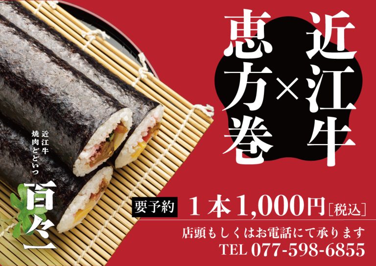 近江牛焼肉百々一では、2024年2月3日(土)に恵方巻を販売いたします。 近江牛が入った贅沢な太巻きとなっております。 ※数量限定50本となっておりますので、お早めにご注文くださいませ。 ※ご予約は店頭もしくはお電話のみ(TEl:077-598-6855)の対応となっております。